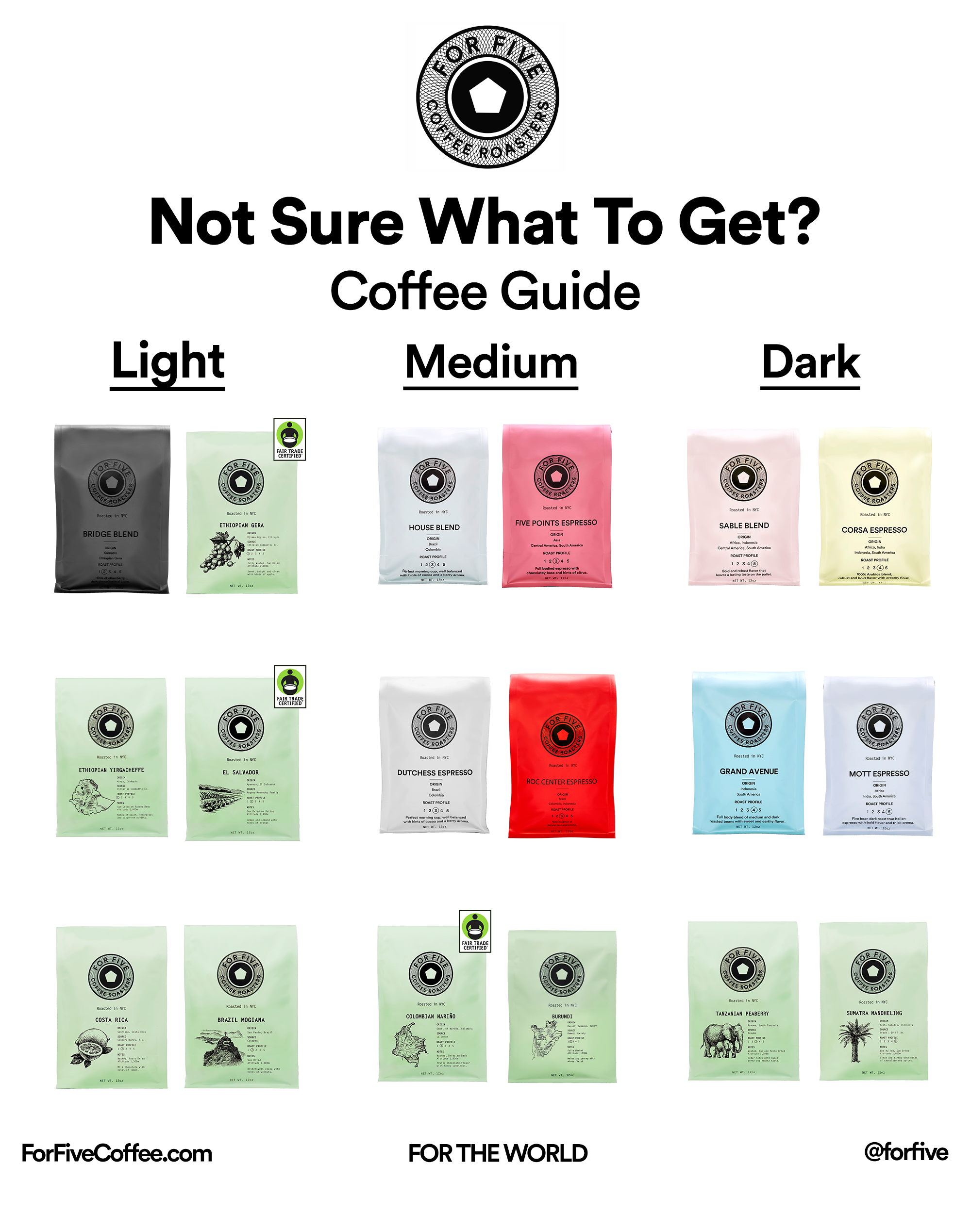 Sable Blend, a For Five signature, sourced from Africa, Indonesia, Central America + South Americafeatures a bold and robust flavor that leaves a lasting taste on the palette. Dark (5/5) roast profile.