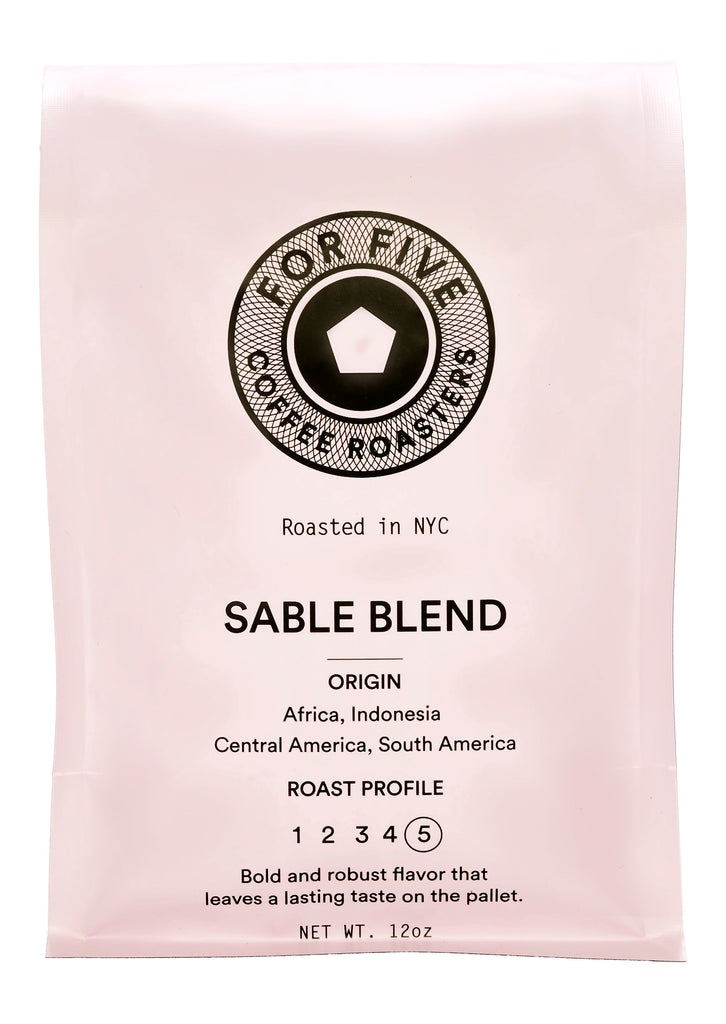 Sable Blend, a For Five signature, sourced from Africa, Indonesia, Central America + South America, features a bold and robust flavor that leaves a lasting taste on the palette. Dark (5/5) roast profile.