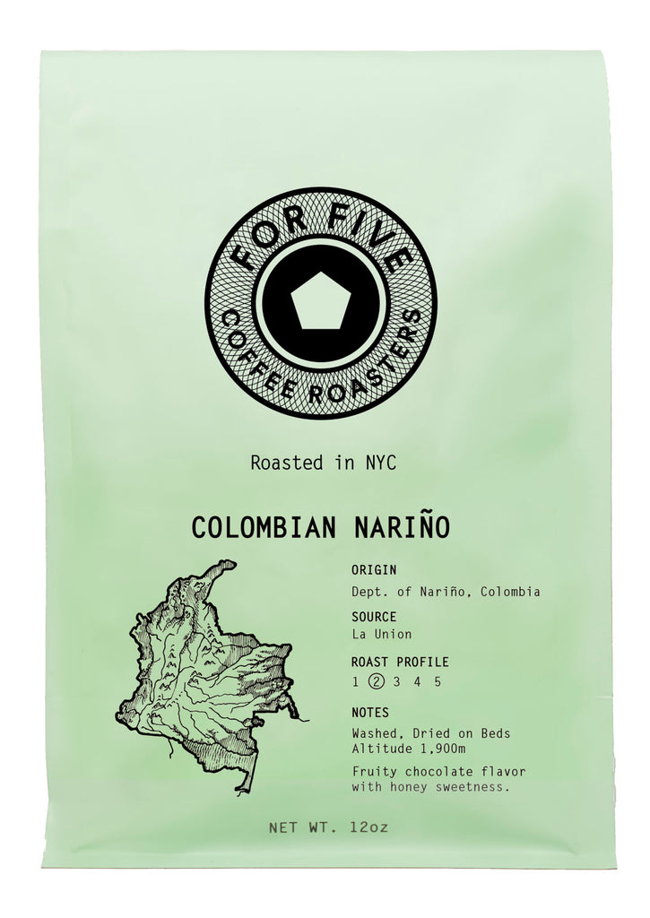 Colombian Nariño, sourced from Dept. of Nariño, Colombia, features fruity chocolate flavors with honey sweetness. Light to medium (2/5) roast profile.