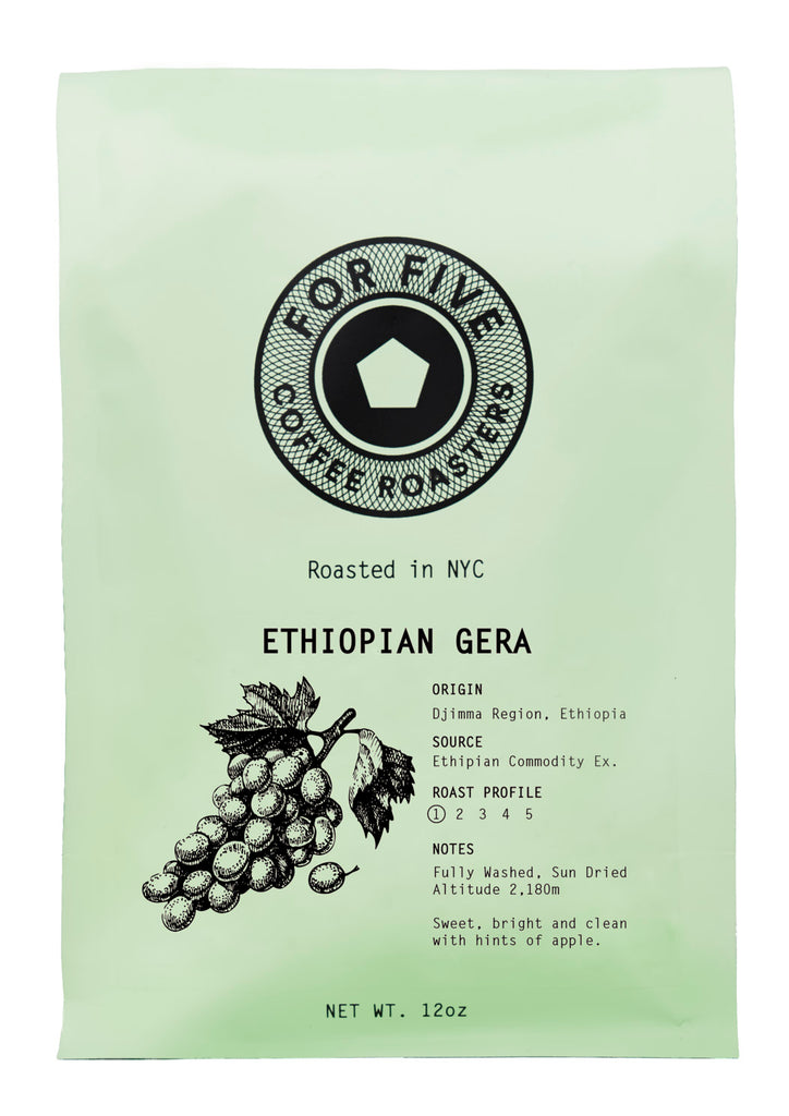 Ethiopian Gera, sourced from Jimma Region, Ethiopia, is sweet, bright and clean with hints of apple. Light (1/5) roast profile.