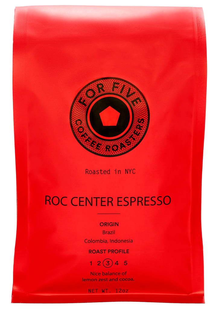 Roc Center Espresso, a blend sourced from Brazil, Colombia + Indonesia, features a nice balance of lemon zest and cocoa. Medium (3/5) roast profile.